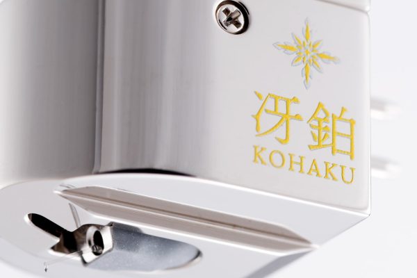 The resulting symbol expresses a delicate balance between the cool brilliance of platinum and the warmth and softness found in KOHAKU’s sound signature.